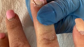 Using an orange stick, gently push back your client's cuticles. Do this gently as you do not want to hurt your client. Once cuticles are all pushed back, use your cuticle nippers to remove any dead skin from the cuticle area. Do this gentle as you don't want to make your client bleed.